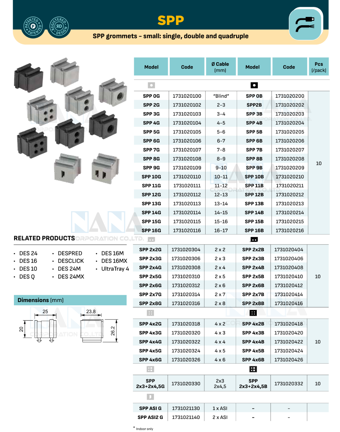 The SPP 4X series cable grommets allow four cables with diameter from 2 to 6 mm to be routed through the DES splitable frames series. Long lasting product and high resistance to industrial oils