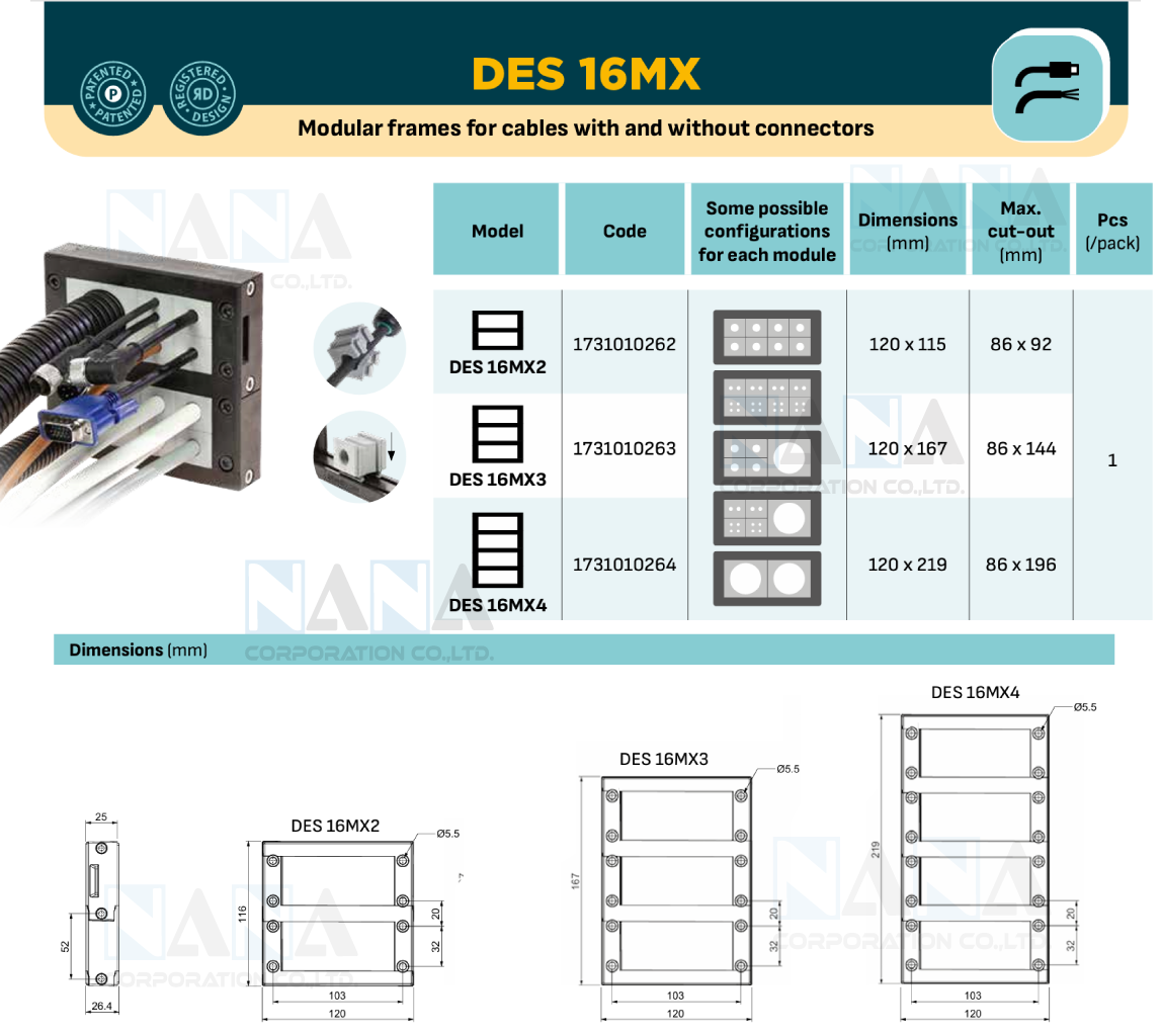 DES 16MX Modular frame for cables with and without connectors