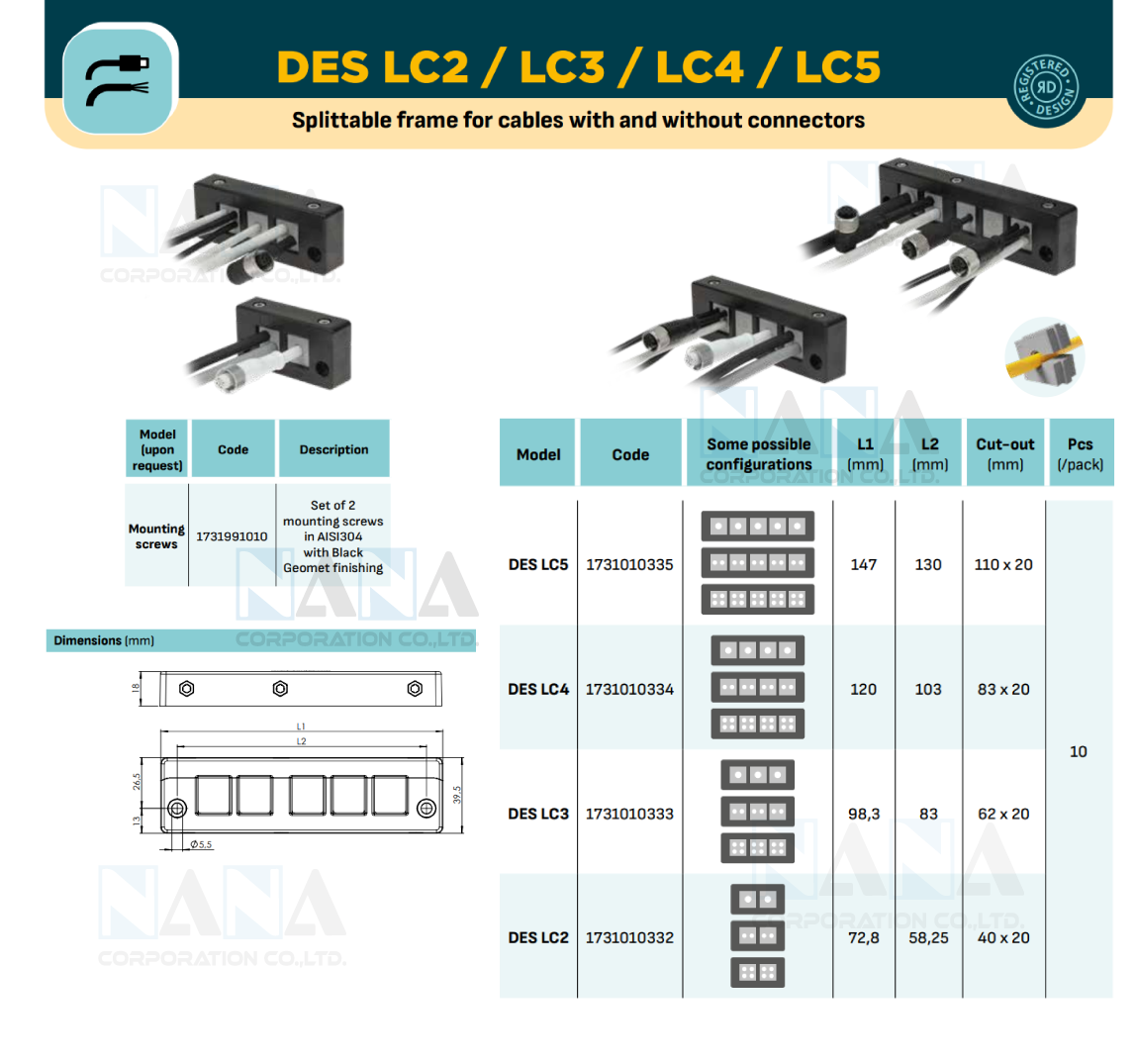 The DES LC5 divisible frame is designed to route cables, with or without connectors, with diameters from 2 to 15 mm, using the available SPC grommets.