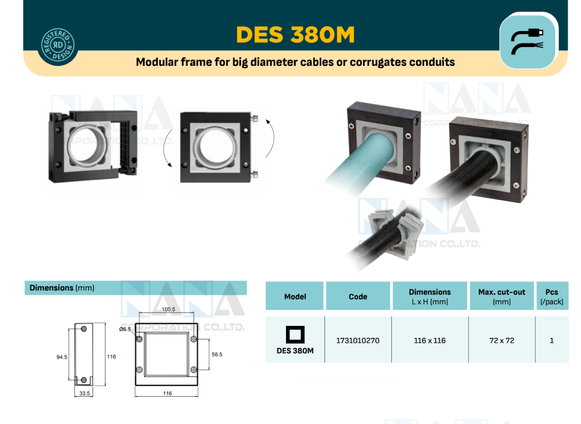 For applications involving largediameter cables, DES 380M split frames provide secure installation and mechanical and fluidtight sealing.