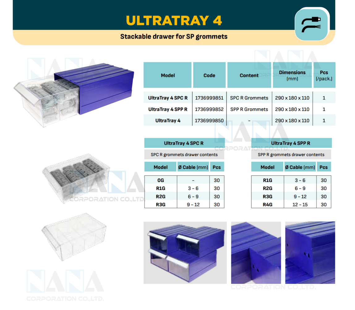 Stackable drawer for SP grommets. Practical drawer containing 120 SPC R or SPP R series grommets, divided into 4 internal compartments for orderly management.