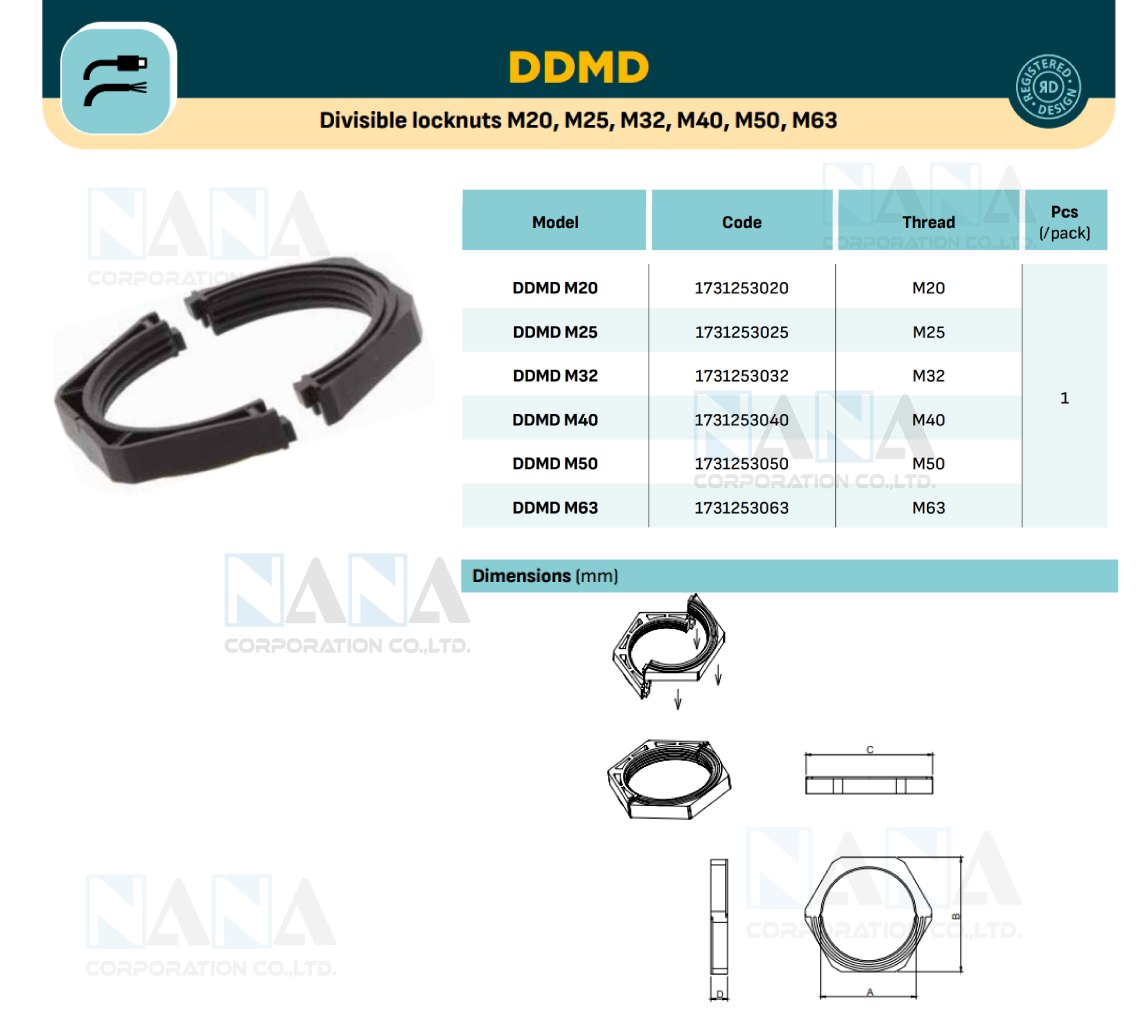 DDMD series openable locknuts are used to allow the routing of connectors which are dimensionally larger than conventional locknuts. They are available in 6 sizes all for metric threads: M20, M25, M32, M40, M50, M63.